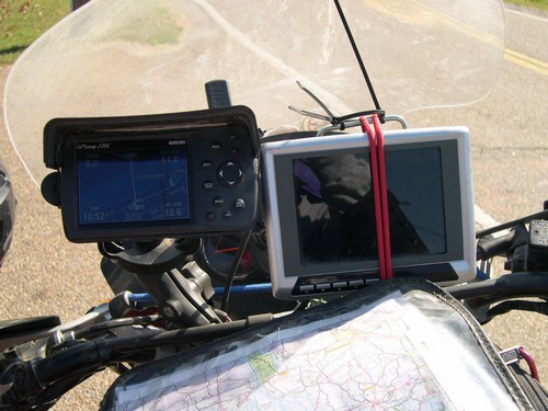 As Kevin would say---"my bike is a work in progress". Kevin was constantly diddling with this and that on his bike--he has made so many personal modifications to his bike---it is a long list. Most things were fabricated by himself. The helmet cam monitor mount was definitely a work in progress----as Kevin didn't have his shop, welder, and fabrications tools with him. This stuff came from K-Mart, Wal-Mart, Toys are Us, Big Lots and the local hardware store during the ride. I see bungie cords, wire tires, tape, and more tape. I'm sure since he got home he has perfected a carbon fiber mount that is a work of art. Me and him both ran Garmin 276C GPS's. |