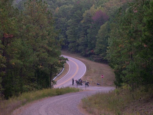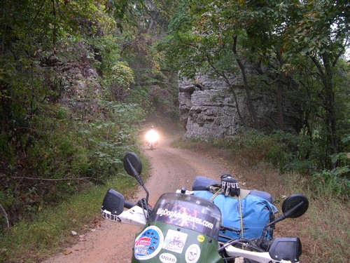 Jay leaves us today and took the pavement to the BMW rally in Potosi--we would see him there. We left Russelville early and made a run for the Oklahoma border. We had come this far--and after a unanimous vote it was decided we would complete our planned ride of 3 states of the Trans-Am Trail--even tho the weather man had a very rainy day predicted for us--we had not had a drop of rain so far. We rode some really nice mountain scenery, which was mostly gravel roads. If you haven't been to Northwest Arkansas you might be surprised at the beautiful mountains there----and lack of population, making for some nice backroad riding. |